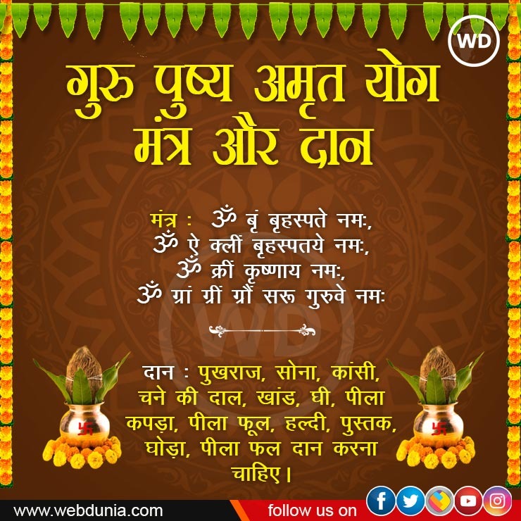 गुरु पुष्य अमृत योग दान-द्रव्य : पुखराज, सोना, कांसी, चने की दाल, खांड, घी, पीला कपड़ा, पीला फूल, हल्दी, पुस्तक, घोड़ा, पीला फल दान करना चाहिए।