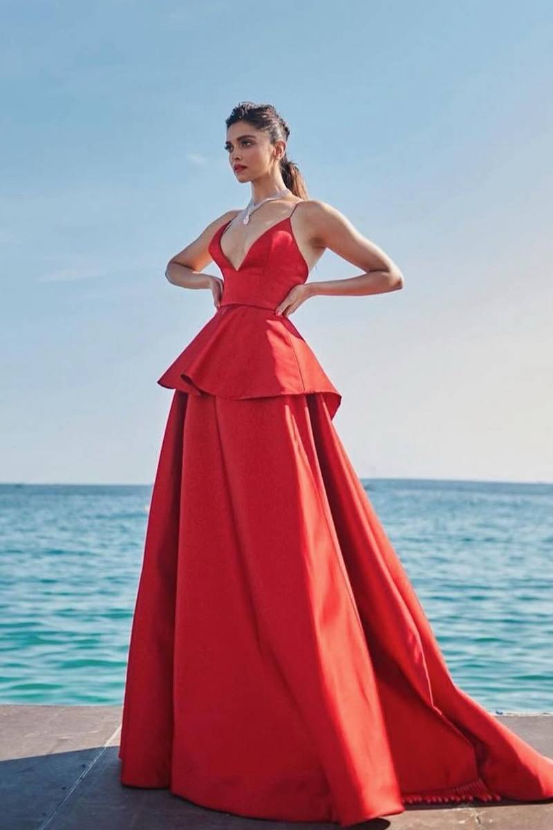समुद्र की पृष्ठभूमि में दीपिका का यह लुक सिनेमाई ग्लैमर से भरपूर था। स्ट्रक्चर्ड बॉडिस और फ्लोइंग स्कर्ट ने शाही अंदाज़ रचा। यह रेड-कार्पेट ग्लैमर का एक आउटडोर फैंटेसी संस्करण था—रोमांटिक, प्रभावशाली और बेहद खूबसूरत।