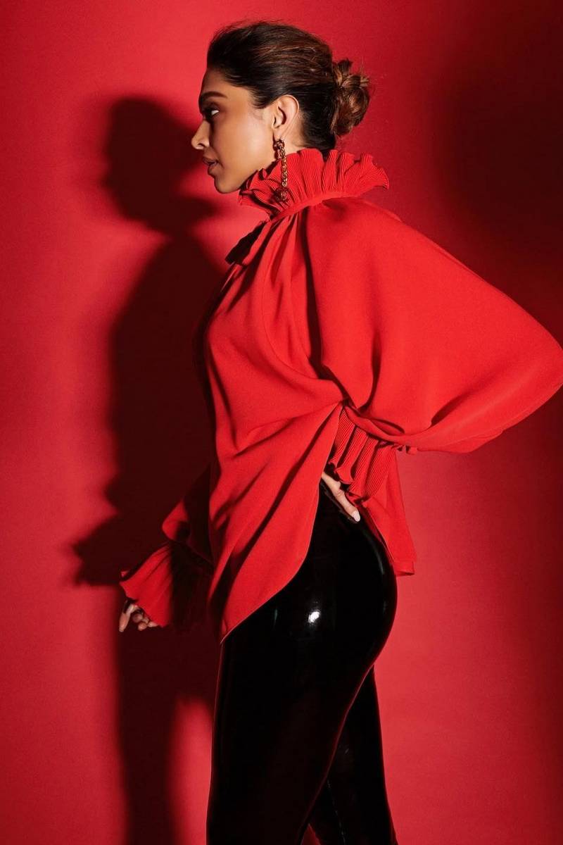 पावर ड्रेसिंग में दीपिका का कोई सानी नहीं। शार्प टेलर्ड रेड ब्लेज़र और फ्लेयर्ड ट्राउज़र्स ने लंबा और आकर्षक सिल्हूट दिया। हेड-टू-टो रेड स्टाइलिंग ने क्लासिक टेलरिंग को फैशन-फॉरवर्ड अंदाज़ में बदल दिया। यह लुक दमदार, आत्मविश्वासी और बेहद शीक था।