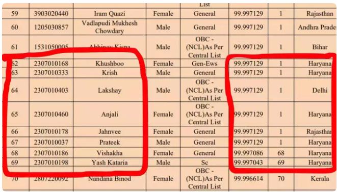 क्या मैनेज हुआ एग्जाम सेंटर : एक्स पर नीट 2024 टॉपर लिस्ट की फोटो शेयर की जा रही है। इसमें सीरियल नंबर 62 से लेकर 69 तक के नीट रोल नंबर, नाम, मार्क्स और रैंक देख सकते हैं। नीट यूजी 2024 रिजल्ट के साथ गड़बड़ी होने का आरोप लग रहा है, क्योंकि यहां जो NEET Roll Number Series है, वह एक जैसी है। ये सभी रोल नंबर एक ही सेंटर या आस-पास के सेंटर से हैं। इनमें ज्यादातर स्टूडेंट्स के नाम के साथ सरनेम नहीं लगा हुआ है। 8 में से 6 स्टूडेंट्स को 720 में से 720 अंक, अन्य दो को 719, 718 अंक मिले हैं। इस खुलासे के बाद स्टूडेंट इसे लेकर शंका जता रहे हैं।