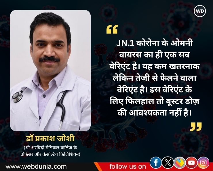 देश में कोरोना वायरस के कारण स्थिति लगातार चिंताजनक होती जा रही है। इस नए वेरिएंट को लेकर कई गलत और भ्रामक जानकारियां भी फैलाई जा रही हैं। कई लोगों का सवाल है कि क्या इस वेरिएंट के लिए बूस्टर डोज़ लगाना ज़रूरी है? साथ ही कई लोग इस वेरिएंट को बहुत भयानक और गंभीर भी बताया जा रहा है। इन सभी सवालों के सही उत्तर होना बहुत ज़रूरी है तो चलिए जानते हैं इंदौर के श्री अरबिंदो मेडिकल कॉलेज के प्रोफेसर और कंसल्टिंग फिजिशियन डॉ प्रकाश जोशी से JN.1 वेरिएंट से जुड़ी सभी जानकारी के बारे में....