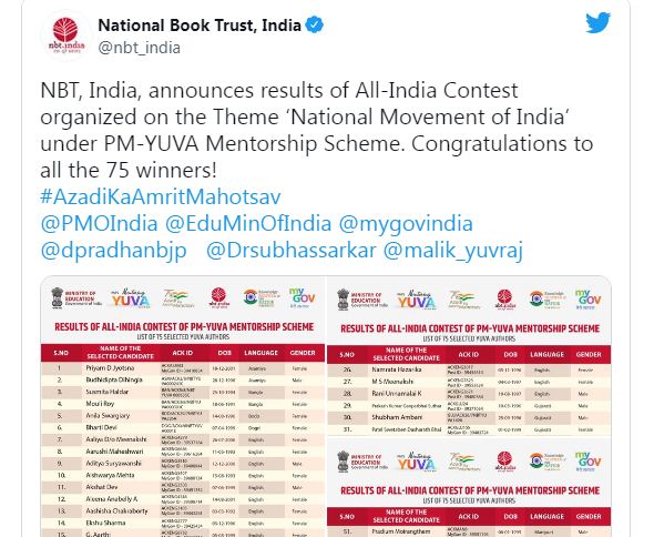 PM YUVA mentorship Scheme Result: नेशनल बुक ट्रस्ट ने भारत का राष्ट्रीय आंदोलन विषय पर आयोजित अखिल भारतीय प्रतियोगिता के परिणामों की घोषणा कर दी है। आजादी का अमृत महोत्सव कार्यक्रमों के अंतर्गत पीएम-युवा मेंटरशिप योजना (PM YUVA Mentorship Scheme) के तहत इस प्रतियोगिता का आयोजन किया गया था। प्रतियोगिता में 75 युवा लेखकों का चयन किया गया है।