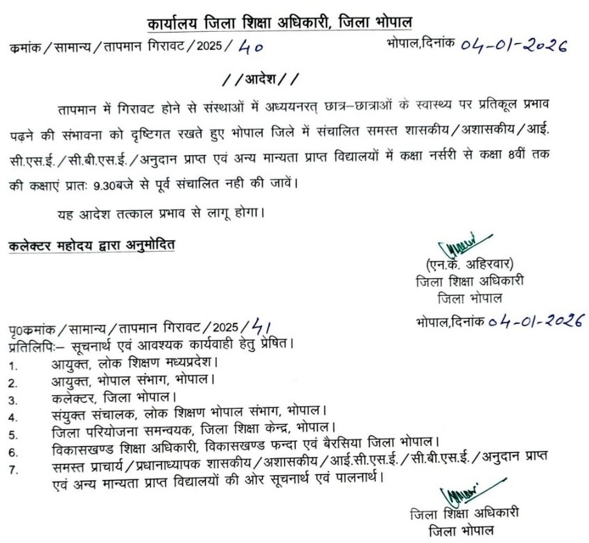Bhopal and Indore administrations new order regarding schools : देशभर में कड़ाके की ठंड पड़ रही है। इस बीच मध्य प्रदेश भी शीतलहर की चपेट में है। शीतलहर और कड़ाके की सर्दी के इस कहर को देखते हुए प्रदेश की राजधानी भोपाल और आर्थिक राजधानी इंदौर में प्रशासन ने बच्चों की सुरक्षा के लिए बड़ा कदम उठाया है। इस बीच प्रशासन ने भोपाल में स्कूलों का समय बदलने का आदेश जारी किया है। जो कि कल यानी 5 जनवरी से लागू होगा। इस आदेश के बाद अब राजधानी भोपाल के स्कूल सुबह 9:30 बजे के बाद लगेंगे। जिला शिक्षा अधिकारी एनके अहिरवार ने आदेश जारी किए हैं। वहीं लगातार शीतलहर को देखते हुए इंदौर जिले के सभी शासकीय-अशासकीय सीबीएसई स्कूलों में कलेक्टर शिवम वर्मा ने पहली से आठवीं तक के बच्चों के लिए 3 दिन का अवकाश घोषित किया है।