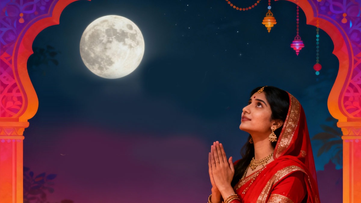• पति का पूजन: चंद्रमा को अर्घ्य देने के बाद, उसी छलनी से अपने पति का चेहरा देखें। पति के चरणों को छूकर आशीर्वाद लें।