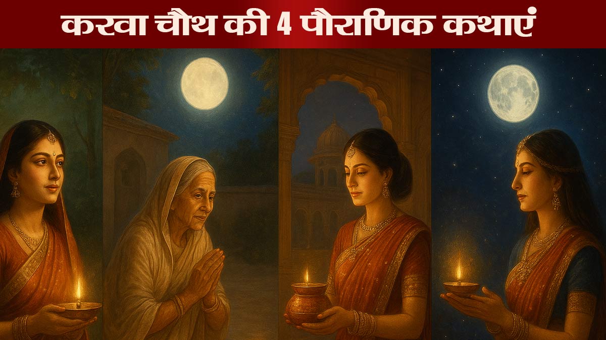 Karwa chauth mata ki katha in hindi: उत्तर भारत में सुहागन महिलाएं अपने पति की सेहत और लंबी उम्र की कामना से करवा चौथ का निर्जला व्रत रखती हैं। सूर्योदय से लेकर चंद्रमा निकलने तक व्रत रखती हैं। रात में चांद निकलने के बाद व्रत खोलती हैं। व्रत की पूजा के दौरान महिलाएं करवा चौथ माता की पौराणिक कथा सुनती हैं। करवा चौथ की 3 कथाएं प्रचलित हैं। तीनों ही कथाओं को सुनने का महत्व है। यहां तीनों कथाओं को संक्षिप्त में पढ़ें।