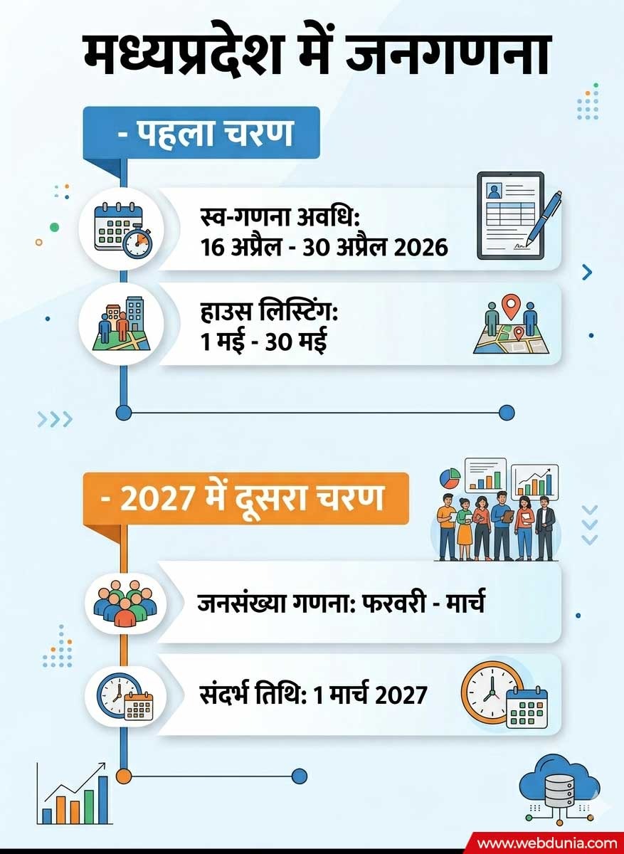 देश में आज से जनगणना का कार्य शुरु हो गया है। भारत मेंं दुनिया की सबसे बड़ी जनगणना दो चरणों में की जाएगी, जिसका पहला चरण आज से शुरू होगा गया है। वहीं दूसरा चरण फरवरी 2027 में होगा। देश में पहली बार जनगणना डिजिटल रूप में हो रही है। जनगणना में पहली बार स्व-गणना (Self-Enumeration) का विकल्प भी दिया गया है। मध्यप्रदेश में जनगणना का पहला चरण 15 अप्रैल से शुरु होगा। वहीं डोर-टू-डोर जनगणना का कार्य 1 मई से शुरु होकर 30 मई तक चलेगा। प्रदेश मे 16 अप्रैल से 30 अप्रैल तक स्व-गणना की समय होगा।