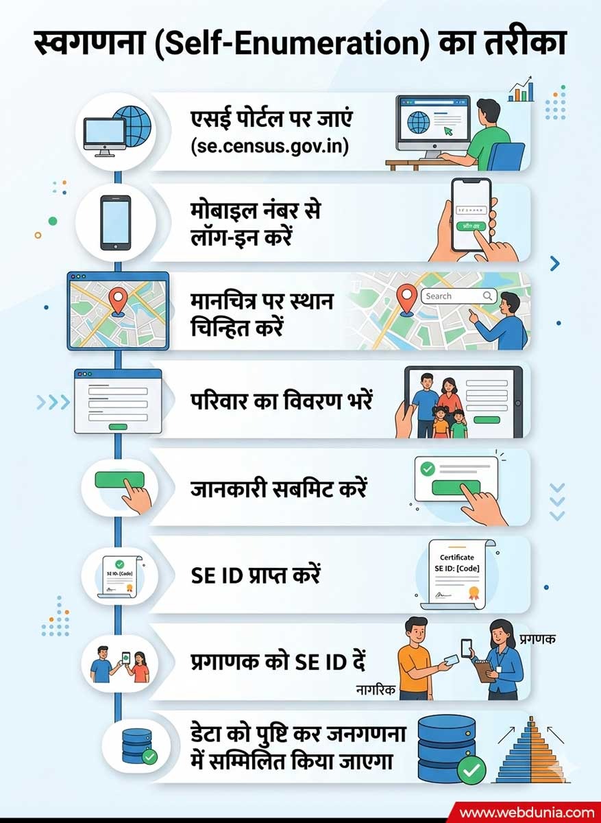 स्वगणना (Self-Enumeration) का तरीका-एसई पोर्टल पर जाएं (se.census.gov.in) → मोबाइल नंबर से लॉग-इन करें → मानचित्र पर स्थान चिन्हित करें → परिवार का विवरण भरें → जानकारी सबमिट करें → SE ID प्राप्त करें → प्रगणक को SE ID दें → डेटा को पुष्टि कर जनगणना में सम्मिलित किया जाएगा