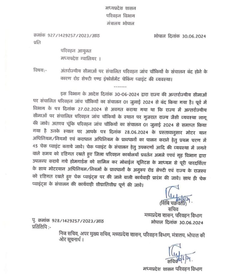मुख्यमंत्री डॉ. मोहन यादव ने दिए निर्देश- मुख्यमंत्री डॉ. मोहन यादव ने परिवहन चेक पोस्ट बंद किए जाने का एलान करते हुए कहा कि प्रधानमंत्री नरेंद्र मोदी के नेतृत्व में सुशासन के अंतर्गत देश में अनेक कार्य किए जा रहे हैं। इस नाते परिवहन क्षेत्र में मध्यप्रदेश में कुछ बदलाव किए गए हैं। चेक पोस्ट संबंधी नई व्यवस्था लागू की जा रही है। एक जुलाई से परिवहन चेक पोस्ट जो अन्य प्रांतों की सीमा पर वाहनों के आवागमन के संबंध में भूमिका अदा करती हैं वहां संबंधित जिला प्रशासन के साथ तालमेल कर वर्तमान में हो रही अव्यवस्थाओं को दूर करने और पारदर्शी व्यवस्था लागू करने का कदम उठाया गया है।