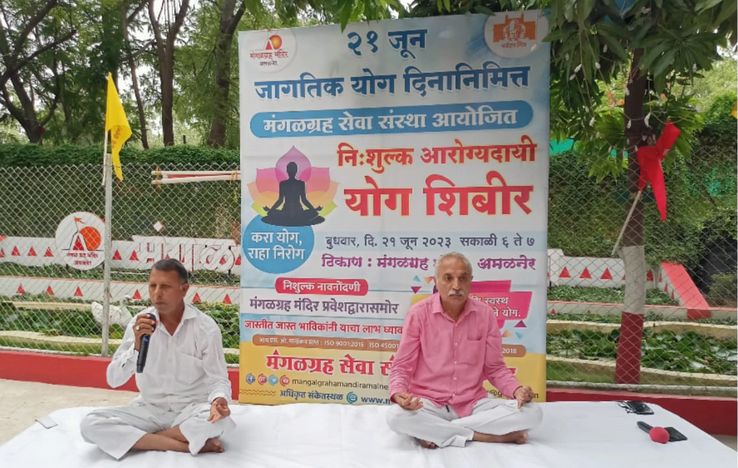 Free Yoga Camp in Mangal Graha Mandir Amalner- 21 जून को संपूर्ण विश्व में विश्व योग दिवस मनाया जा रहा है। इस अवसर पर महाराष्ट्र के अमलनेर में स्थित मंगल ग्रह सेवा संस्थान ने भी नि:शुल्क योग शिविर का आयोजन किया। इस अवसर पर संस्थान के सेवकों के साथ ही कई गणमान्य नागरिक उपस्थित थे। यह योग शिविर सुबह 6 बजे से 7 बजे तक आयोजित किया गया।