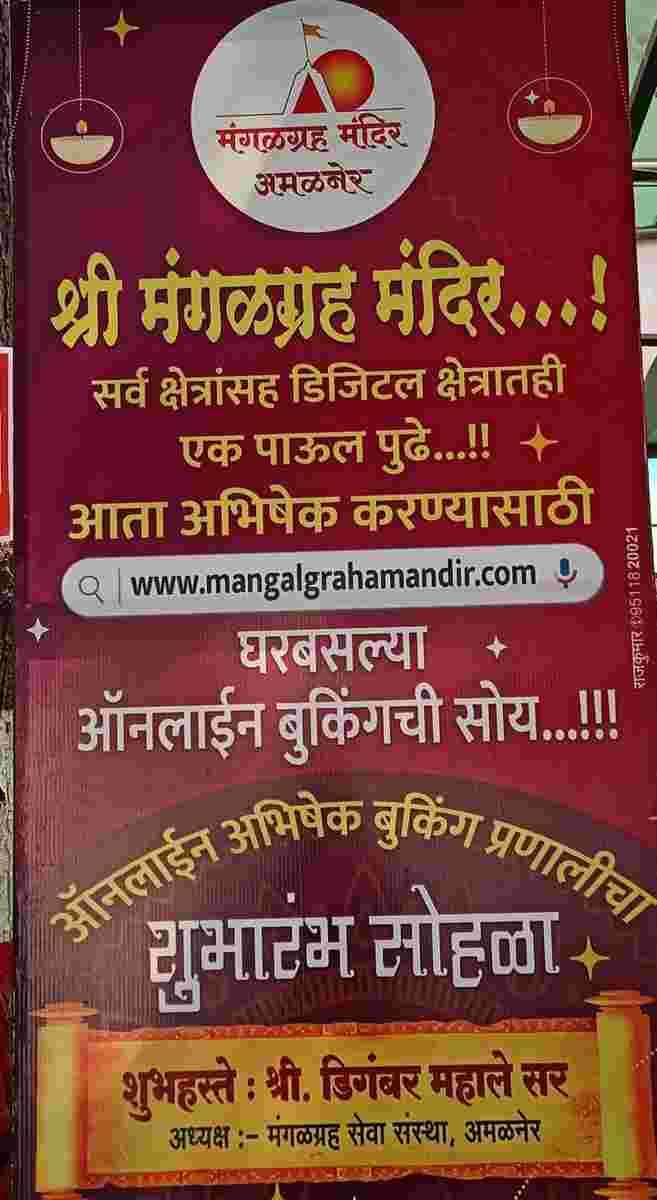 अमलनेर स्थित मंगलग्रह मंदिर में महाराष्ट्र सहित पूरे भारत से श्रद्धालु अपनी आस्था के चलते यहां दर्शन और अभिषेक के लिए आते हैं। भक्तों की सुविधा के लिए मंदिर ने अब ऑनलाइन अभिषेक बुकिंग की सुविधा कर दी है। यदि भक्त मंगलग्रह मंदिर में अभिषेक करने के लिए आना चाहते हैं तो घर बैठे ऑनलाइन अभिषेक बुक करा सकते हैं।