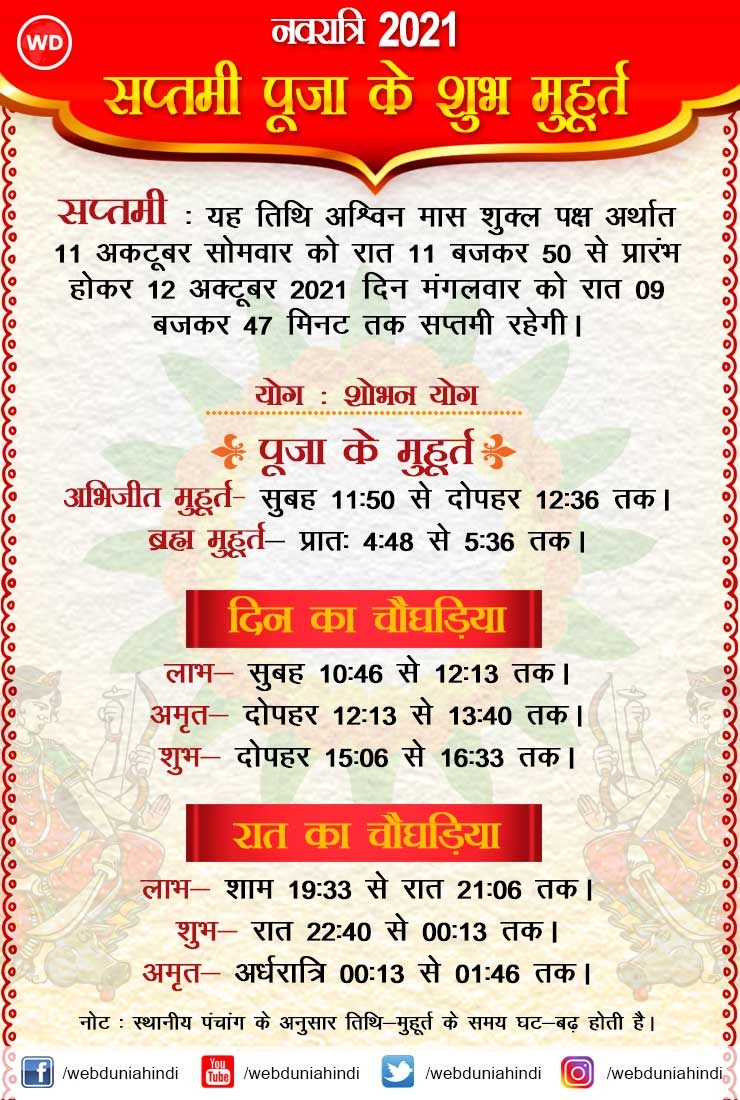 नवरात्रि की सप्तमी तिथि को माता का कालरात्रि रूप का पूजन किया जाता है। इनका रूप अन्य रूपों से अत्यंत भयानक है, लेकिन माता अत्यंत दयालु-कृपालु हैं। ऐसे लोग जो किसी कृत्या प्रहार से पीड़ित हो एवं उन पर किसी अन्य तंत्र-मंत्र का प्रयोग हुआ हो, वे इनकी साधना कर समस्त कृत्याओं तथा शत्रुओं से निवृत्ति पा सकते हैं।