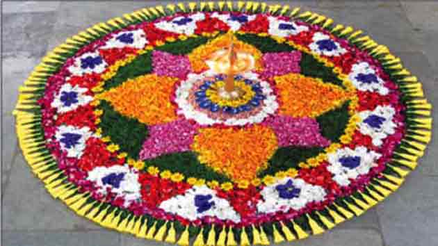 2. बनाते हैं फूलों का घर : जिस तरह दशहरे में दस दिन पहले रामलीलाओं का आयोजन होता है या दीपावली के पहले घर की रंगाई-पुताई के साथ फूलों से सजावट होती रही है। उसी तरह ओणम से दस दिन पहले घरों को फूलों से सजाने का कार्य चलता रहता है। घर को अच्छे से सजाकर बाहर रंगोली बनाते हैं। खासकर घर में कमरे को साफ करके एक फूल-गृह बनाया जाता है जिसमें गोलाकार रुप में फूल सजाए जाते हैं। प्रतिदिन आठ दिन तक सजावट का यह कार्यक्रम चलता है। इस दौरान राजा बलि की मिट्टी की बनी त्रिकोणात्मक मूर्ति पर अलग-अलग फूलों से चित्र बनाते हैं। प्रथम दिन फूलों से जितने गोलाकार वृत बनाई जाती हैं दसवें दिन तक उसके दसवें गुने तक गोलाकार में फूलों के वृत रचे जाते हैं।
