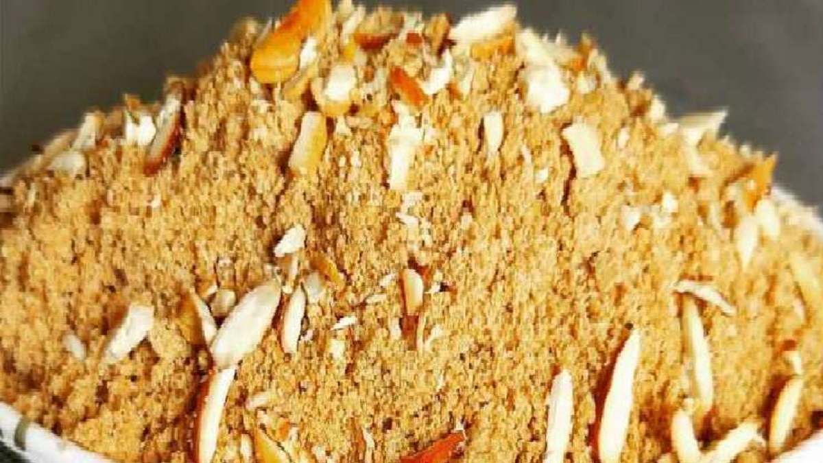 4. फिर पुन: कढ़ाई में घी डालकर गेहूं का आटा धीमी आंच पर खुशबू आने तथा गुलाबी होने तक भूनें।