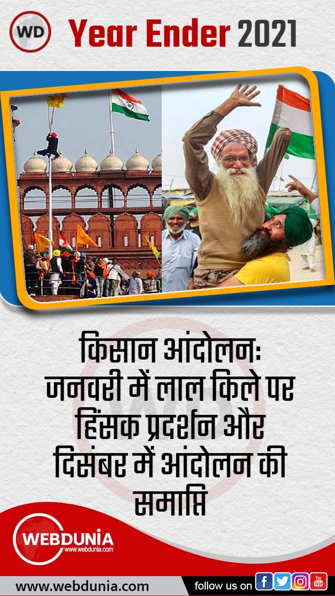सालभर देश में छाया रहा किसान आंदोलन। जनवरी में लाल किले पर हिंसक प्रदर्शन के बाद राकेश टिकैत ने फिर किसानों को एकजुट किया। दिसंबर में मोदी सरकार द्वारा कृषि कानून वापस लेने और किसानों की सभी मांगों को मानने संबंधी आश्वासन पर समाप्त हुआ आंदोलन।